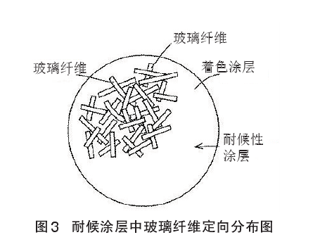 該高耐候性彩色水泥瓦制作流程是將以水泥為主要成分的坯料擠壓成坯,瓦體養護硬化,涂以涂料,修平整,形成底層涂膜層。為了防止瓦中堿分對上層涂膜層的侵蝕,可在底涂膜層上,涂以耐堿性涂料,形成耐堿涂膜層,然后涂以著色涂料,形成裝飾涂膜層,最后涂以耐候涂料,形成耐候涂膜層(見圖1和圖2)。著色涂層由含有所需著色顏料的水性丙烯酸涂料構成,其厚度約為100μm。耐候性涂層由與著色層相同的水性丙烯酸涂料與耐候性纖維(添加量為7%~12%)組成的涂料構成,其厚度約為 25μm。耐候性涂料用噴槍高壓噴涂在瓦著色裝飾涂層上。耐候性涂料涂覆在著色涂層上時,玻璃纖維以平躺姿態,水平方向無序隨機定向分布(見圖 3)。對瓦涂以耐候性涂料后,為了固定玻璃纖維,約在100℃下充分干燥。